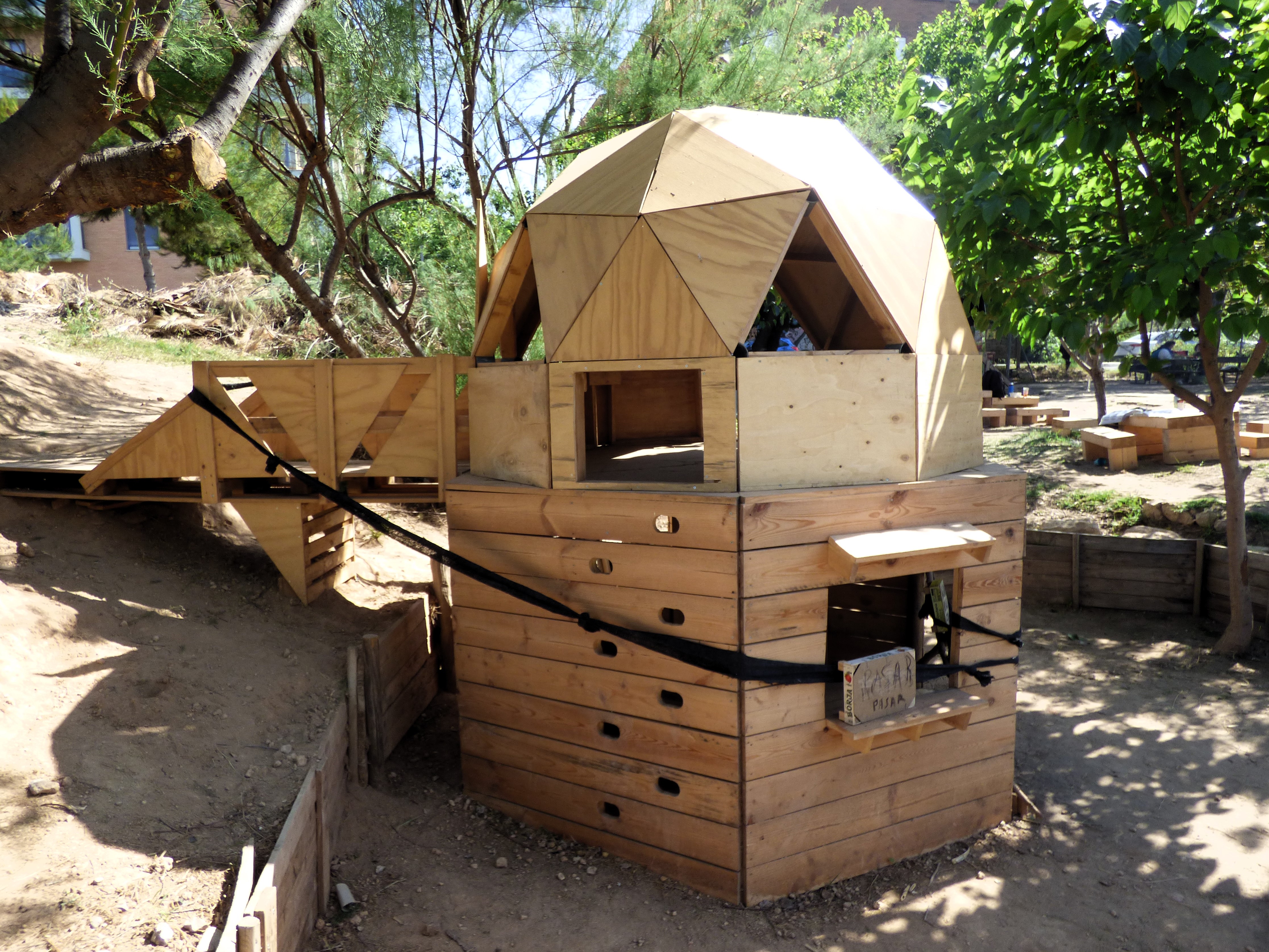 Si la anterior zona de juegos infantil ha durado una década, la intención es que el Domo que la sustituye “aguante como mínimo otros diez años”, explica Pablo. Para su construcción han utilizado madera reciclada, a partir de palets de diferentes tamaños y de palos que se utilizan como guías para los árboles de las calles que ya estaban para retirar.