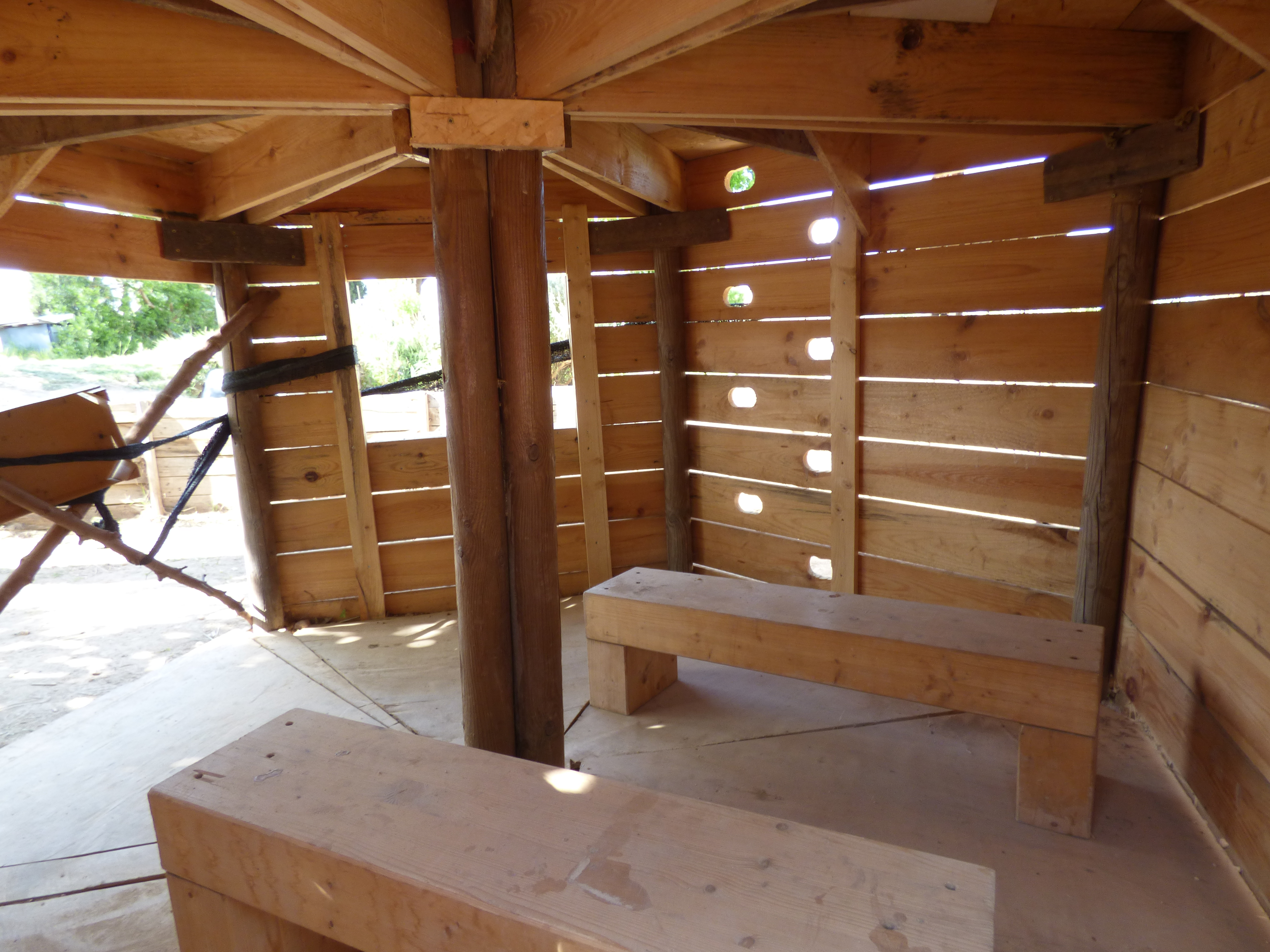 Además, como se trata de madera que va a estar a la intemperie, bajo los rayos del sol y bajo la lluvia que caiga, se ha optado por darle un barniz ecológico en lugar de pintarla, ya que con la lluvia la pintura se puede disolver y filtrarse a la tierra, donde llegaría a los cultivos cercanos.