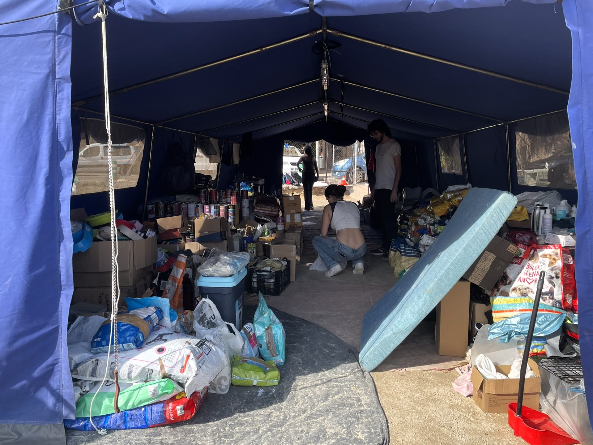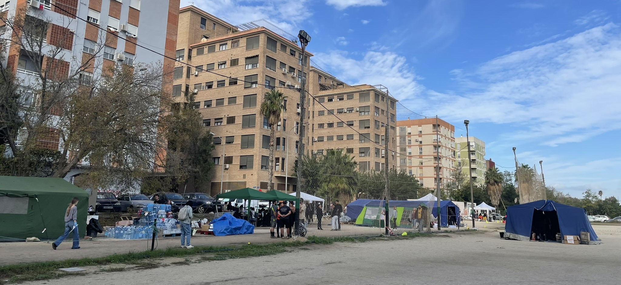 Pero además, el campo se ha convertido en un punto de recogida de materiales para personas afectadas, como agua, comida, productos de higiene y sanitarios o material para para limpiar el fango.