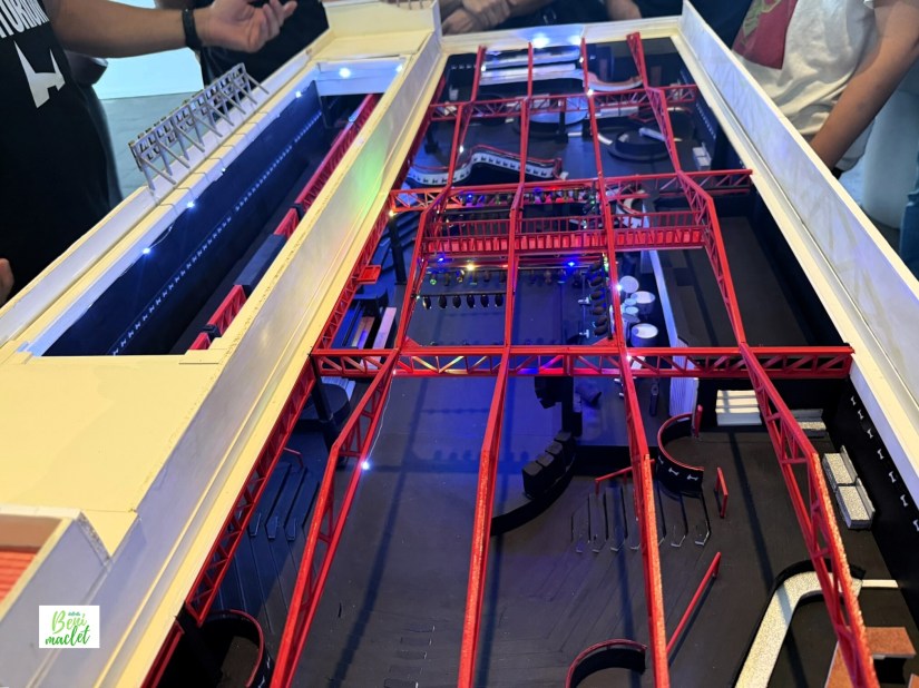 La maqueta “mide más o menos 1.600 por 700 milímetros y está a escala 1:50. La sala en sí eran unos 70 por no llega a 30 metros”, nos cuenta Félix, quien señala que ha recurrido a esa escala para que se puedan apreciar bien los detalles, aunque confiesa que de haber tenido más espacio le hubiera gustado hacerla el doble de grande.