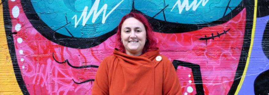 Para la entrevista, Bel ha dudado entre varios rincones del barrio y finalmente ha elegido como fondo un colorido grafiti de gran tamaño de Deih, pues siempre le ha gustado el arte urbano y considera que esta obra es “un lienzo muy bonito” para nuestra charla.